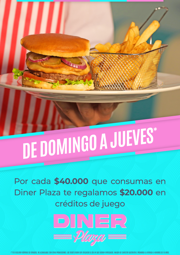Disfrutá tus comidas en Diner Plaza y llevate más diversión. Durante todo el mes de septiembre, por cada $40.000 que consumas, te regalamos $20.000 en créditos de juego para que sigas disfrutando en el casino.